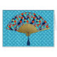 Een Art Deco Japanse ventilatornotitiekaart in een traditioneel, gestileerd chrysanthemumpatroon dat wordt gebruikt in Japanse textielproducten, in tinten blauw, turquoise en helder rood, geschetst in goud, donkerblauw, met een in reliëf gemaakte goudbasis en een coördinerende deco-gepatterde achtergrond