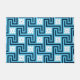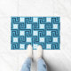 Doormat in een Art Deco Griekse sleutel of labyrint patroon in de zachte hemel blauw en donkere marine / indigoeroe, voorzien van witte