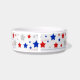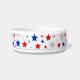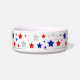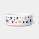 Een decoratieve huisdierbak versierd met rode, witte en blauwe sterren.