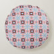 A decorative pillow featuring a symmetrical geometric pattern with blue, white, and brown hues shown from the front and back on a gray background.