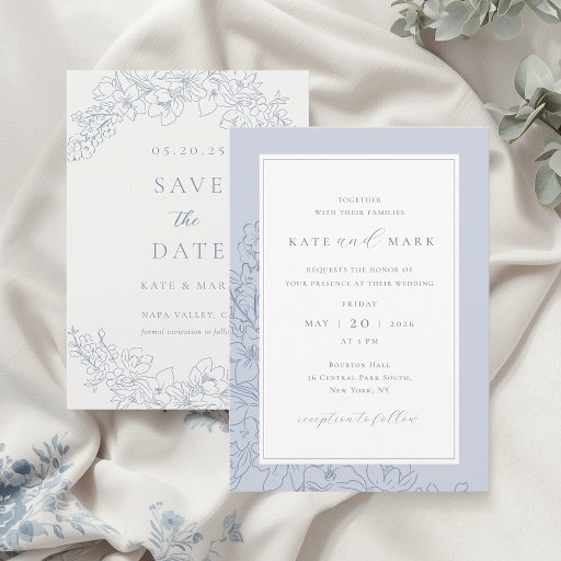 Set a tone of understated elegance for your special day with our delicate blue floral wedding invitation. Perfect for a "Something Blue" or coastal wedding theme, these elegant wedding invites features delicate blue florals, coordinating perfectly with dusty blue, slate, or navy wedding palettes.
