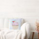 Een kussen met een illustratie van een heerlijke cupcake met roze wervelingen en een bes met bladeren genesteld in de vorst. Set op een lichtblauwe pastel waterverf achtergrond.