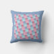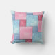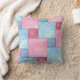 Een werpkussen of kussen, met een faux patchwork van roze en blauw denim patroon, van een met de hand geschilderd ontwerp van de waterverf door Judy Adamson. Het patroon op de achterzijcoördinaten maar is niet identiek.