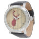 Een horloge met een rustieke stijl. Ontworpen met een hertenkop met gewei, gemaakt van rode plaid. Een afbeelding van houten planken voor de achtergrond geven het een buitenlandgevoel.