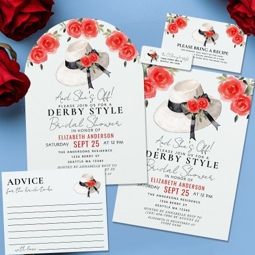 Vier de aanstaande bruid met deze chic en modern uitziende derby-stijl bruidsuitnodiging met een waterverf illustratie van een grote hoed met rozen en een zwarte strik op een lichtblauwe achtergrond. De achterkant heeft een patroon van zwart-wit gestreepte stof. Personaliseer het om aan uw wensen te voldoen.