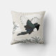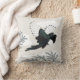 Een prachtige geïllustreerde magpie vliegt in wolken en sage takken op lichtgroen-grijze achtergrond. Blauwgroen, groen, grijs, zwart, wit.