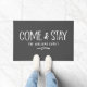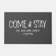Een moderne rustieke deurmat waardoor je je echt welkom voelt. Een geweldig cadeau voor pasgetrouwden of nieuwe huiseigenaren, onze aangepaste kom en verblijf deurmat in elegante duurzame grijs en wit functies "Kom en verblijf" in moderne, rustieke handgeschreven lettertype. Personaliseer met uw familienaam in klassieke witte letters. Ontworpen voor u door Blackberry Boulevard.