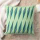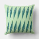 Het kunstwerk van het worpkussen heeft een patroon van cyaankleurige, langwerpige, diamantvormen gerangschikt in een gradiënt, illusionaire en driedimensionale rasterachtige formatie tegen een vers pasteltheegroen canvas.
