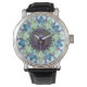 zwarte lederen riem met een afbeelding van een digitaal kunstwerk gemaakt van afbeeldingen van diamantvormige blauwe topaz en randdotedelstenen, smaragddriehoeken, parels en glasvezel in een  omgeving. Zie bijpassende ronde knop, ronde charm, grote ronde sleutelhanger van hoogwaardig metaal, ronde dubbelzijdige acrylsleutelhanger, zwenkbare sleutelhanger en rond ketting. Zie het volledige collectie van het Horloge van de Gemstenen & van de Medallions in de sectie van de ACCESSOIRES.