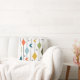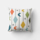 Dit kussen heeft een modern ontwerp uit het midden van de eeuw van verticale lijnen met diamanten en boemerangs, met steruitbarstingen verspreid op de achtergrond.