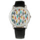 Dit mannen horloge heeft een modern, middeleeuws ontwerp van diamanten in oranje, geel, turquoise, grijs, en geschetst verspreid over een gebied van wit.