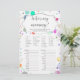 Deze baby shower game card is voorzien van een modern script op de achtergrond van meerdere stippen, perfect voor een baby jongen, een baby girl of een verrassing! Gebruik deze kaart voor je sekse openbaring. Achterzijde met de antwoorden.