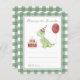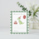 Waterverf kinderen verjaardagsfeestje. Waterverf Dino in verjaardagskaartje, pet met kaarsjes, rode ballon. Groene kooi achtergrond.