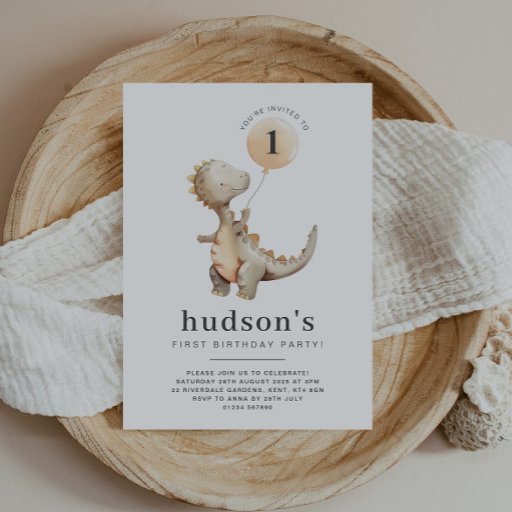 Een vrolijke dinosaurus met een ballon, perfect voor uw Roar-some dinosaurus themafeest! U kunt nummer 1 in de ballon wijzigen in een willekeurig nummer of het nummer verwijderen als u dat wilt. U kunt de tekst ook langs de onderkant bewerken.