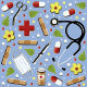 Uniek cadeaulint met medisch thema met gezondheidszorgbenodigdheden en een bloempatroon op een blauwe achtergrond.