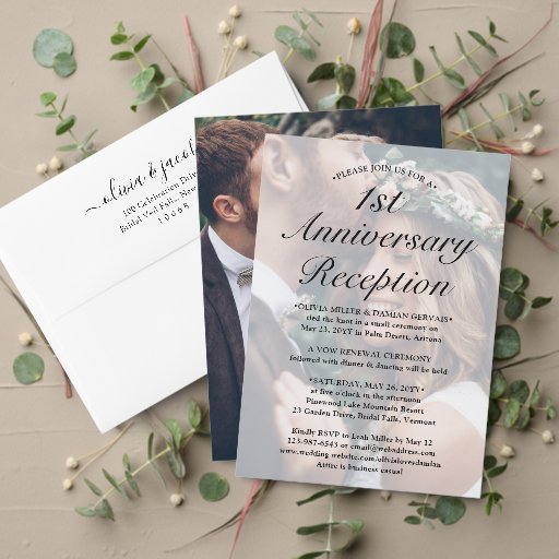 Als onverwachte omstandigheden hebben geleid tot het uitstellen van je bruiloftsfeest, is de eerste verjaardag een perfecte gelegenheid om een jaar later toch te vieren. Nodig familie en vrienden uit voor een eenvoudig elegante 1e verjaardagsfeest met een stijlvolle, op maat gemaakte witte en gouden folie uitnodiging met foto. Alle teksten zijn eenvoudig aan te passen voor elk aantal jaren of soort evenement, waaronder een hernieuwde belofteceremonie, feest na een elopement, vervolg bruiloftsfeest, cocktailuur of dinerfeest. Pas het aan om de details van je keuze toe te voegen, zoals trouwdatum, kledingvoorschrift, RSVP, website, enz. Het moderne, minimalistische witte en gouden ontwerp bevat echte metalen folie, één foto van het pasgetrouwde stel, trendy handgeschreven kalligrafie en chic typografie in schrijfmachinestijl. Of je nu bent weggelopen, een kleinere, minimalistische ceremonie of microbruiloft hebt gehad, of dat je speciale