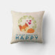 Kussens met een cartoon tekening van een schattige oranje vos die rustig met weinig rode harten slapen. Een groen blad dat achteraan loopt. De tekst zegt: "Doe wat je gelukkig maakt". Een roomkleurige achtergrond met een trendy patroon van zwakke geometrische vormen.