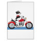 Een hond rijdt met een rode motor. Zijn oren, sjaal en staart vliegen in de wind en zijn helm heeft botbreuken.