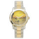 Dit eWatchFactory Two-Tone Watch heeft een ontwerp van dolfijnen die in de baai zwemmen als de zon ondergaat over de Nijl. Piramides op de achtergrond. Een oranje gloed licht de scène op terwijl de zon langzaam vervaagt. Voeg een structuureffect toe door de achtergrondkleur te wijzigen in zwart. Zet het terug uit met een witte achtergrond. Klik op de oranje knop 'Aanpassen' om toegang te krijgen tot het bewerkingsvenster. Terwijl je er bent, personaliseer het met jouw naam of een andere tekst. Meer dan 300 lettertypen om uit te kiezen en veel kleuren, evenals een invoervak voor hexadecode voor een nauwkeurigere keuze.