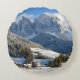 Ronde gooiende kussens met het dorp St. Magdalena (Santa Maddalena) met zijn kerk in het Villnoesstal in Zuid-Tirol, Italië, in de sneeuw tijdens de winter.