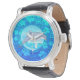 Dolphin springt door een symbool van de Maori-zon met een blauwe oceaan en een zeilboot erachter. Blauwe Honu-schildpadden en blauwe hibiscus-bloemen, ondergrond.