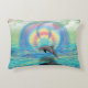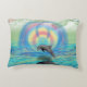 2 dolfijnen zwemmen in de oceaan in de buurt van een prachtige stijging van kleuren en water met twee planeten, een maan en een kleurrijke zon. Roze, blauwe, aqua, gele en groene kleuren in het water en de lucht.