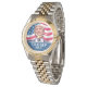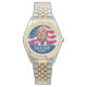 Een traditioneel ontwerp met een foto van Trump met een Amerikaanse vlag die op de achtergrond zwaait. De klassieke doopvonten worden gebruikt om tot dit een klassiek ontwerp voor deze verkiezing te maken. Hij is actief bij de verkiezingen van 2020 in de Republikeinse Primaire. Oorspronkelijke foto genomen door Gage Skidmore;