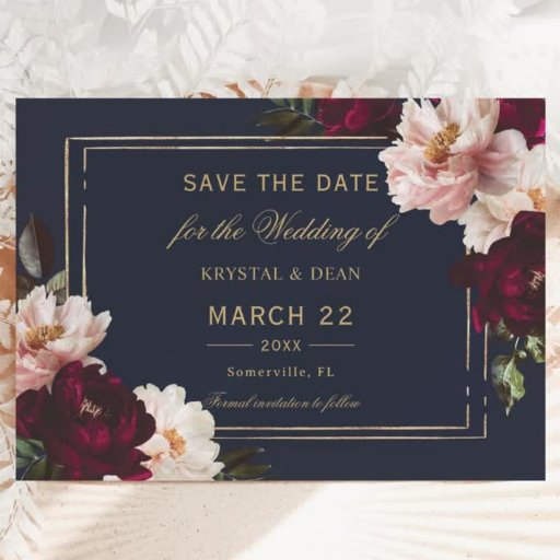 Personaliseer deze elegante bruiloft slim programma kaart gemakkelijk en snel. Klik op de knop Bewerken met ontwerpgereedschappen om de tekst te bewerken, de lettertypestijl, de kleur en de grootte te wijzigen. Met prachtige realistische bordeauxrode, blozende pioenroos bloemen tegen een donkere marineblauwe achtergrond. Personaliseer deze dubbelzijdige programmakaart met uw evenementenlijst en lijst met huwelijksfeesten. Overeenkomende objecten beschikbaar in winkel. c) Somerset Fine Paperie