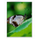 Donkere bruine en grijze vlinder tegen een achtergrond van groen.