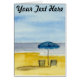 Een eenvoudig waterverf landschap van het verwelkomen van strandstoelen en strandparaplu door het zee. Pas de tekst aan door deze aan uw wensen aan te passen.