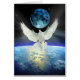 Een witte dove van de Vrede verspreidt zijn vleugels boven de blauwe horizon van de Aarde van Planet met een neonblauwe maan op de achtergrond. De zonsopgang schijnt aan de rand van de wereld en lichte stralen baden de aarde. Dit is een prachtig ontwerp om de wereldvrede en eenheid te bevorderen voor het nieuwjaar, de Dag van de Aarde, of voor elke gelegenheid. Voor christenen is de Dove een symbool van de Heilige Geest, de Vredesgeest of de Geest van God.