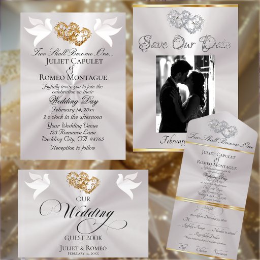 This romantic design features an elegant lavender pearl background with linked hearts & doves. Details for the event in elegant script on the front and a QR code, with monogram placeholder and place for your website on the back. Available in several colors for your wedding theme colors. Designed to coordinate with the "Two Shall Become One - Silver & Gold" Wedding Collection. To change details, click «Personalize». To move the text or change the text size, font, or color click «Click to customize further»