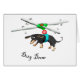 Een cartoon van een gelukkige zwarte en geelbruine dachshund, met behulp van een rode en groene drone. Humor.