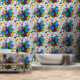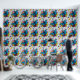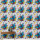 Blauwe en zwarte draak met vlindervleugels genesteld tussen een boeket kleurrijke bloemen in een achtergrond van lichtblauw.
