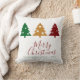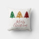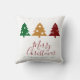 Dit kussenontwerp heeft drie kerstbomen in drie verschillende levendige kleuren rood, groen en goud met moderne typografie Merry Christmas. Personaliseer dit levendige kleurrijke kussen met uw groet, familienaam en jaar.