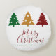 Dit kussenontwerp heeft drie kerstbomen in drie verschillende levendige kleuren rood, groen en goud met moderne typografie Vrolijk kerstfeest. Personaliseer dit levendige kleurrijke ronde kussen met uw groet, familienaam en jaar.
