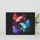 Drie lichtgevende, rode, paarse, groene, getextureerde nachtvogels op een zwarte lichtgevende achtergrond.
