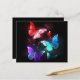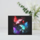 Drie lichtgevende, rode, paarse, groene, getextureerde, nachtelijke vlinders op zwarte lichtgevende achtergrond.