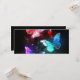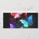 Drie lichtgevende, rode, paarse, groene, getextureerde, nachtelijke vlinders op zwarte lichtgevende achtergrond.
