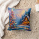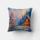 Een dromerig, abstract schilderij van een kleurrijke kerstboom en grillige oude hut in prachtige besneeuwde bergen.