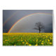 Mooie dubbele regenboog in de stormachtige hemel boven gele bloemen