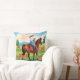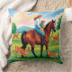 Dit ontwerpconcept toont een kant van een dubbelzijdig werpkussen, met een moeder te paard met haar kind die naar een hert kijkt dat op gras loopt.
