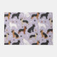Kute German Shepherds in zwart-tan, zwart-wit, rood, zwart-zilver, witte en achterkleurige coatings zitten en staan met verspreide botten en poetafdrukken op een lichte paarse achtergrond.