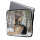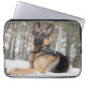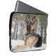 De Duitse herderhond die zich in de sneeuw met een camoflaug gekleurde bandana poselt.