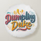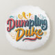 Een grillig en speels ontwerp met de tekst "Dumpling Duke" in een handgetekend, kleurrijk cartoonistisch lettertype met wervelende bloemen. De levendige kleuren en speelse typografie creëer een gevoel van plezier en opwinding.