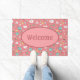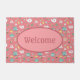 donkerroze welkomstmat bedrukt met een theepatroon van theekopjes, theepotten, lepels en suikerklontjes. Perfect voor theewinkels, cafés en deuren van het tuincentrum