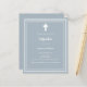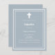 Stoffige blauwe achtergrond, versierd met een wit lijst en een wit kruis Personaliseer en voeg de naam en details toe. Witte tekst. 1 vel = 1 uitnodiging bedrukt rand tot rand.