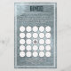 Deze baby boy baby shower bingokaart is voorzien van een mooi maar gedurfd art deco stijl design. Uw bingoregels verschijnen in het midden bovenaan met behulp van een lettertype in oude wereldstijl. Er staat "BINGO" als belangrijkste kop. De achtergrond is voorzien van een faux textuur golvend blauw ontwerp met stijl scroll artwork framing van de kaart aan de onderkant. Deze kaarten keren alleen om naar de stoffige blauwe faux textuur achtergrond met de woorden "Dank je!".