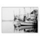 Garnaalboten aan de dop op een witte ochtend, zwart-wit, waterreflectie
