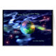 Kaart met mijn originele digitale kunstwerk van de aarde in de ruimte, omringd door kleurrijke aura's, sterren en muzieknoten met de boodschap "de dag dat de aarde stopt met zingen, we stoppen met dansen".